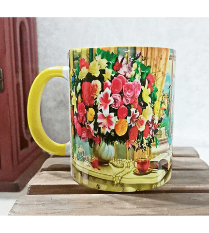 Cam önündeki çiçekler vintage baskı büyük boy porselen kupa