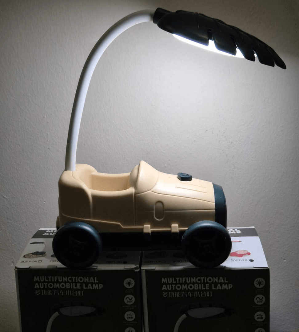 Yeşil - krem sevimli antika araba görünümlü masa lambası, kalemlik, telefon tutacağı